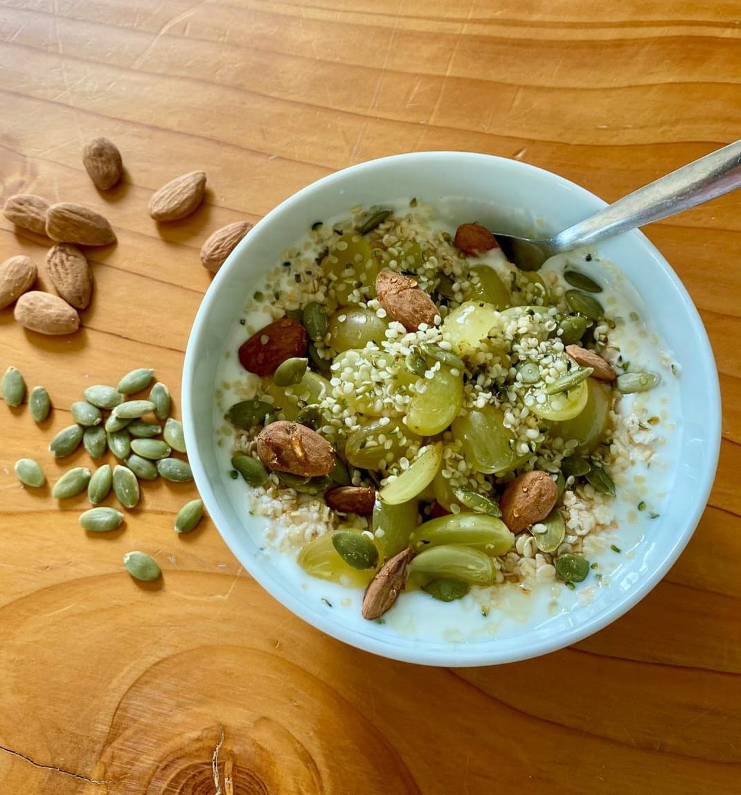 La Budwig che trovi nell’immagine l’ho preparata con fiocchi di avena, miele di montagna, mandorle tostate, semi di zucca e canapa e uva bianca.